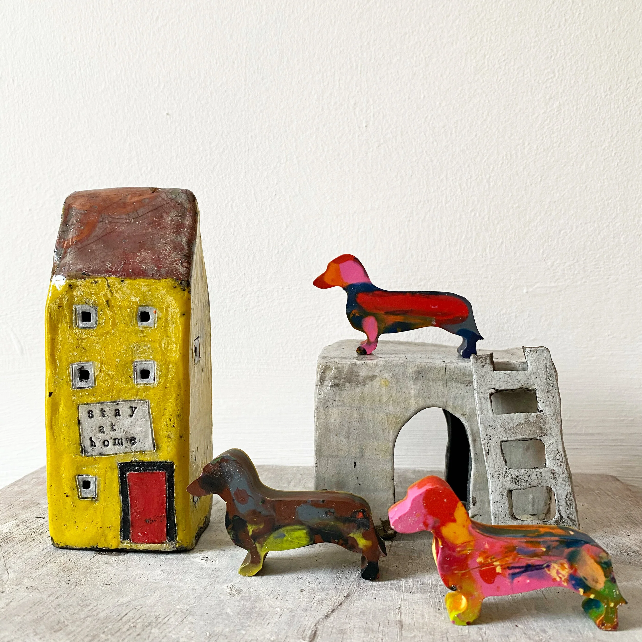 Melted crayon dachshunds and one of my Stay at Home raku ‘cafes’.